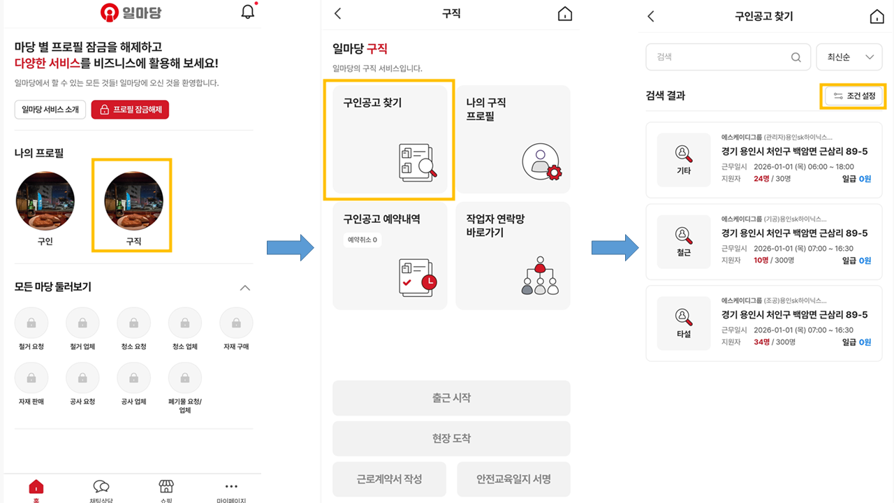 인력 (구직) 작업시간과 작업장소는 어디서 확인하나요?