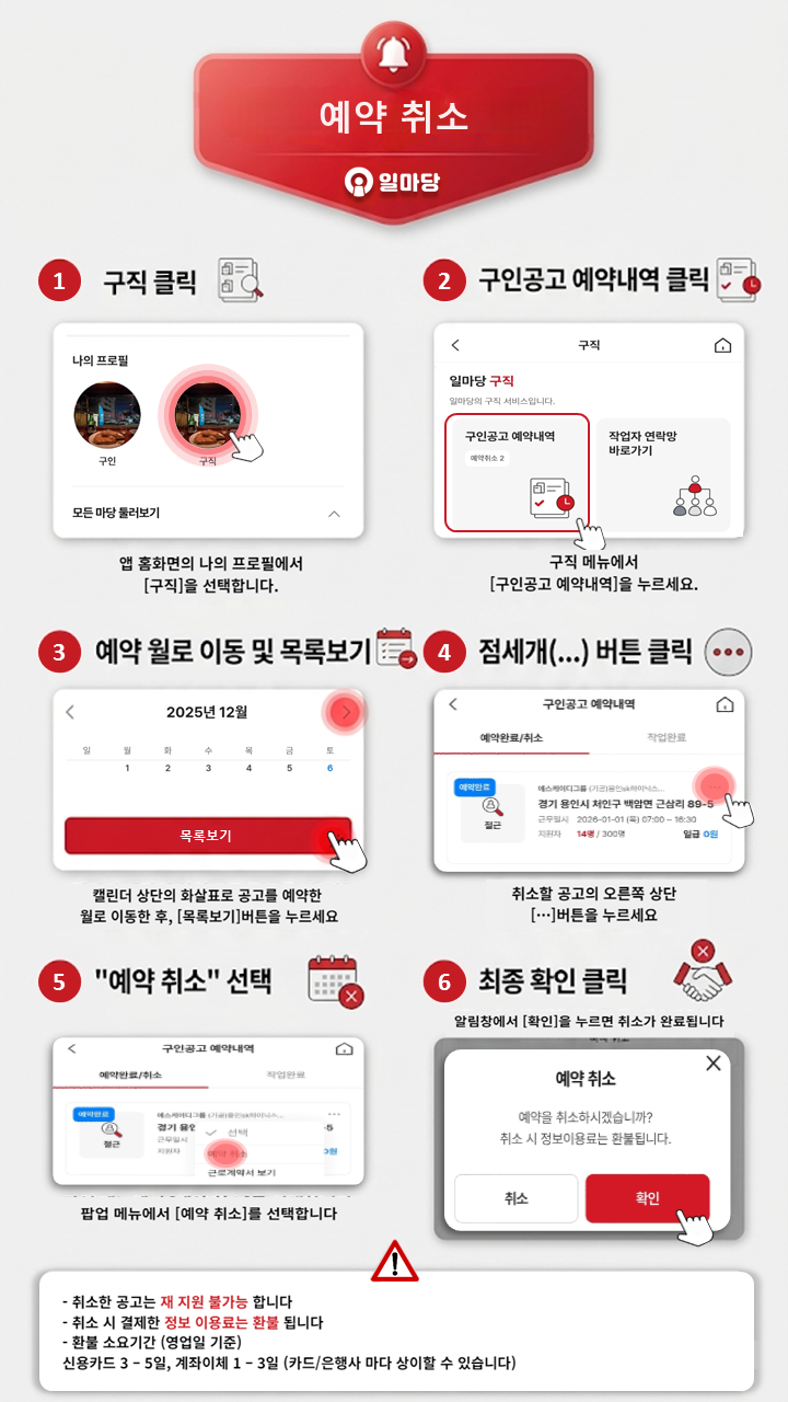 * 예약취소 가능 시간은 당일 또는 익일 공고는 예약 후 30분 이내 또는 그 외의 경우, 근무 시작일 24시간 이전에 가능합니다.